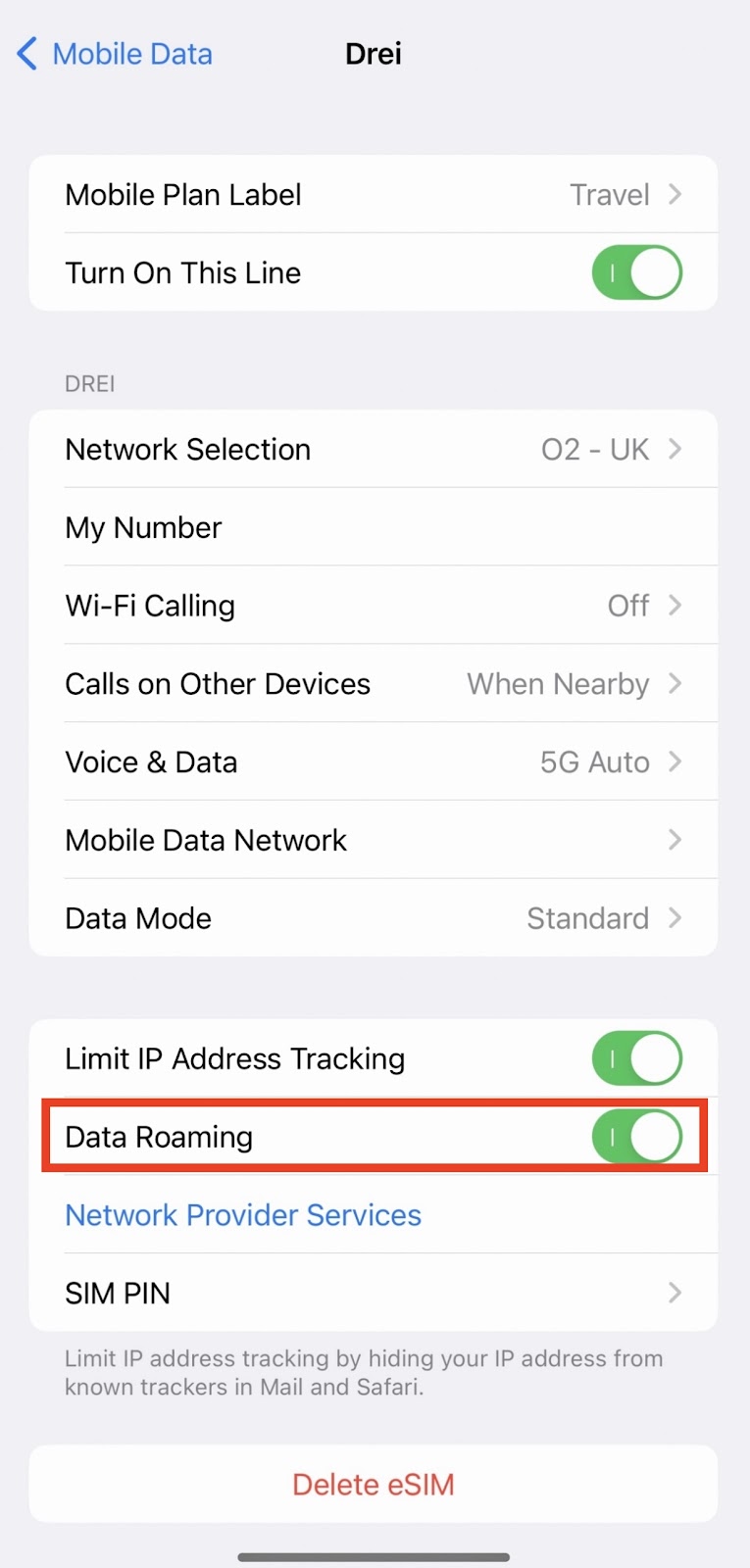 Функция "Роуминг данных" ДОЛЖНА быть включена, чтобы eSIM работал. Перейдите в "Настройки" > Нажмите "Мобильные данные / Сотовая связь" > Выберите eSIM, для которого вы хотите проверить роуминг данных > переключите переключатель в положение "Включено".